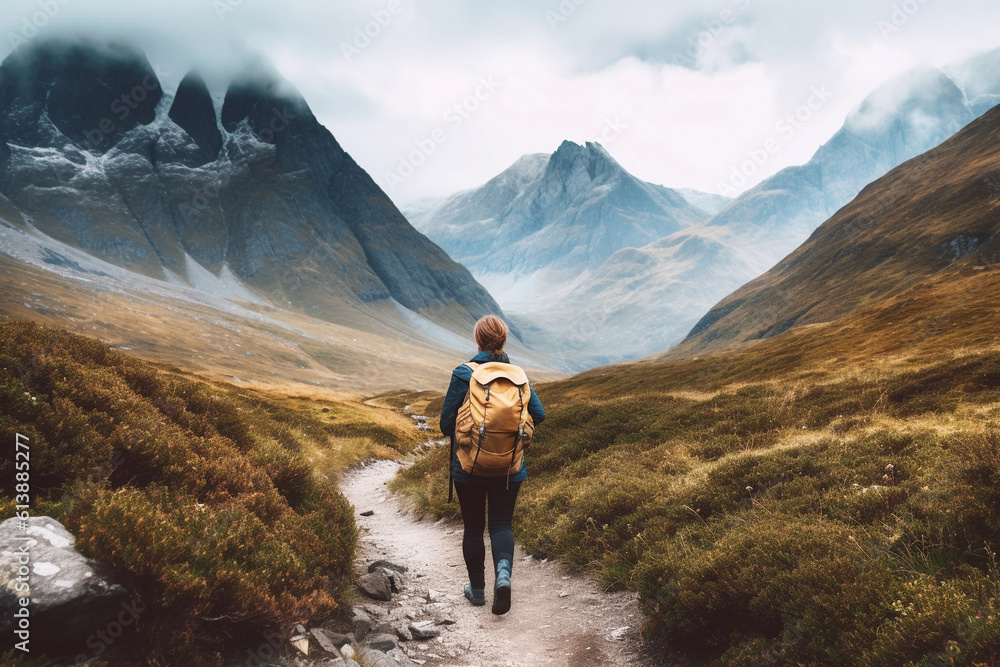 Sport - Hiker walking to mountains.Image ai generate #613885277