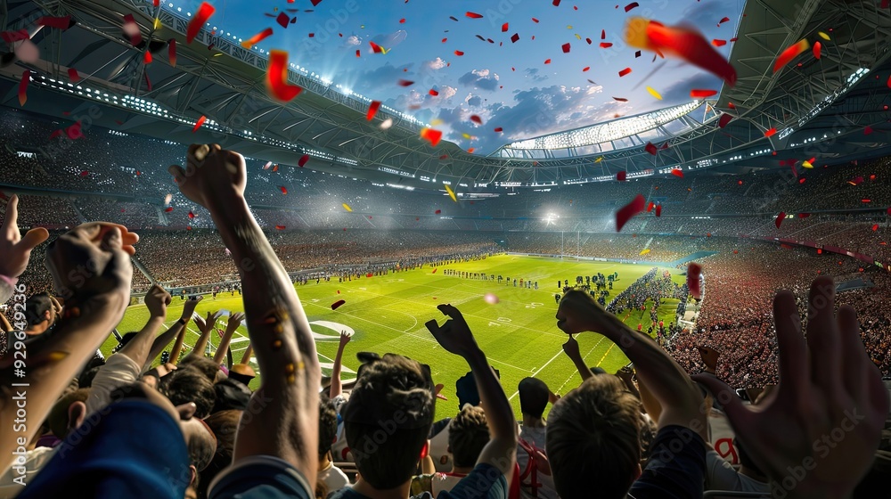 Sport - Crowded stadium with cheering fans during a sports event. Large outdoor arena filled with... #929649236
