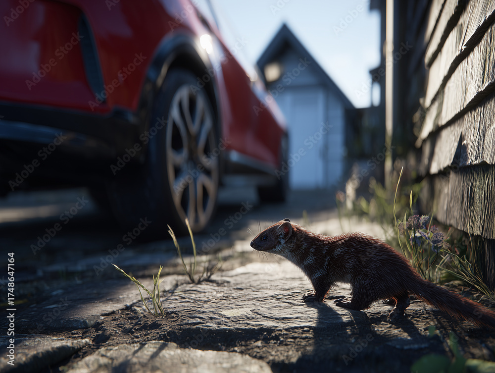 • Kuna przemykająca po brukowanym podjeździe, blisko drewnianego budynku. W tle, na pierwszym planie, rozmyte, czerwone tylne koło samochodu.