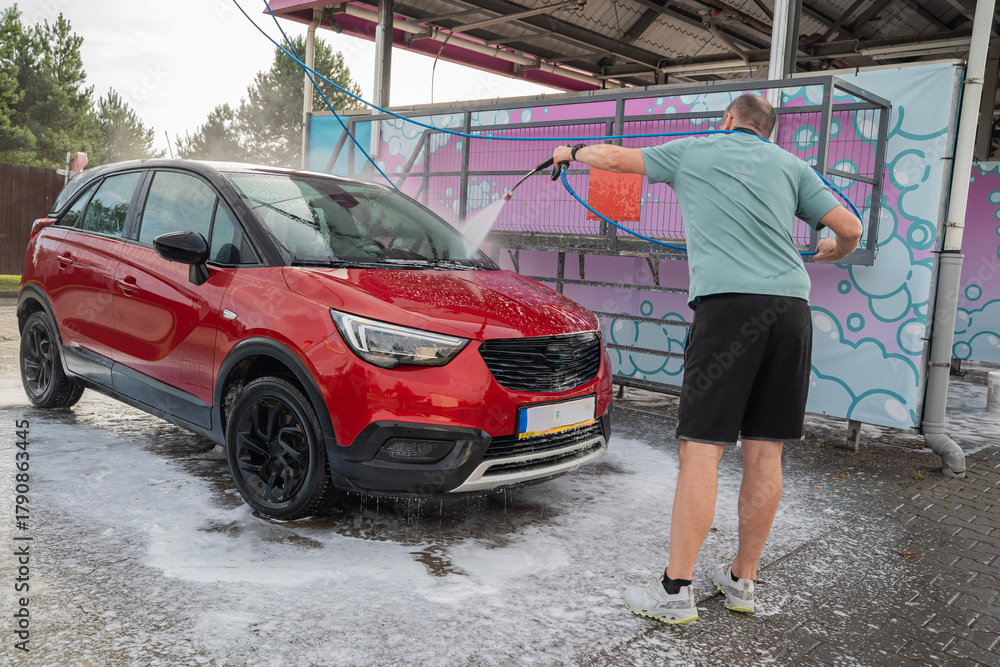 Auta - mężczyzna myjący samochód na myjni samoobsługowej #1790863445