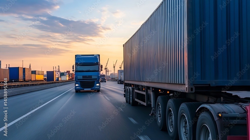 • Blue semi-trucks transport cargo containers on highway at sunset, near a port with cranes and stacked shipping containers. : Generative AI