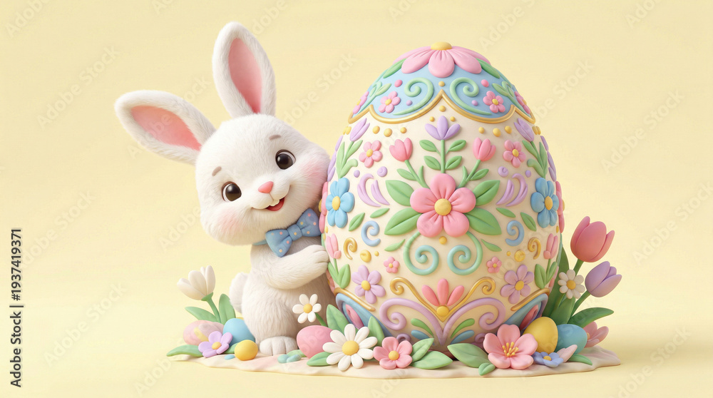 • Świąteczny króliczek Wielkanocny z ozdobioną dużą pisanką. Ilustracja dla dzieci z króliczkiem i jajkiem.