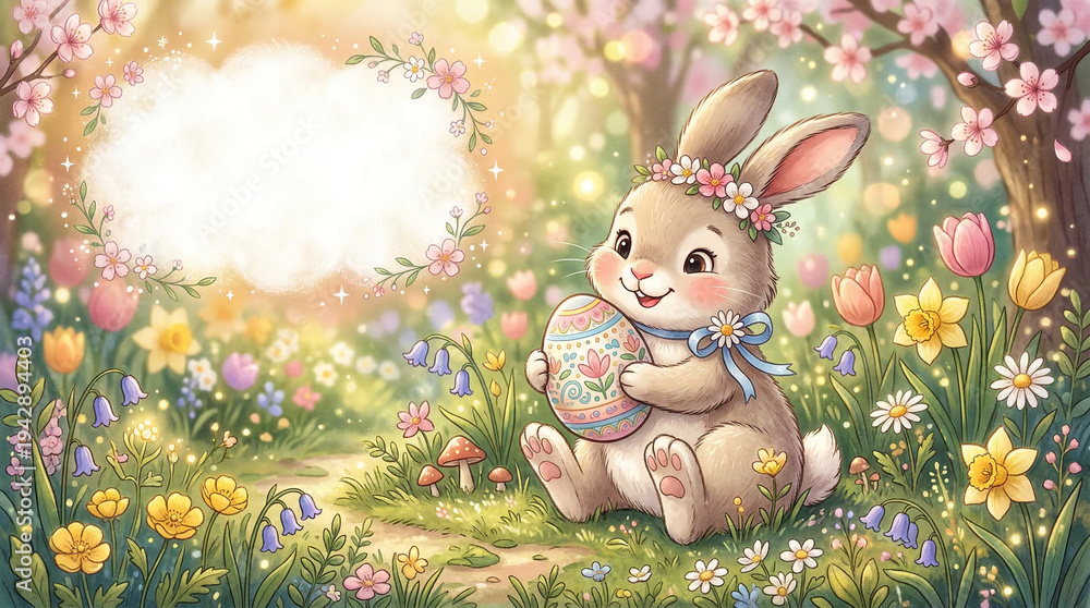 Bajki - Kartka Wielkanocna przedstawiająca zajączka wielkanocnego trzymającego pisankę. #1942894403