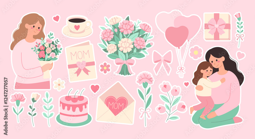 • A collection of Mother's day stickers featuring a woman and child, with a variety of flowers, balloons, and other decorations.