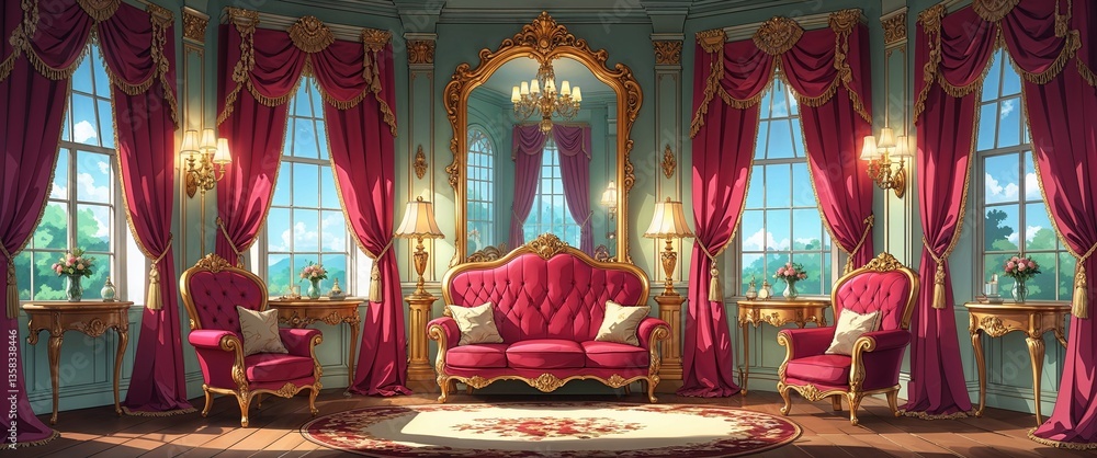 Dla Dzieci - cartoon Luxurious Victorian parlor with velvet drapes and gilded mirror anime illustration art... #1358338446