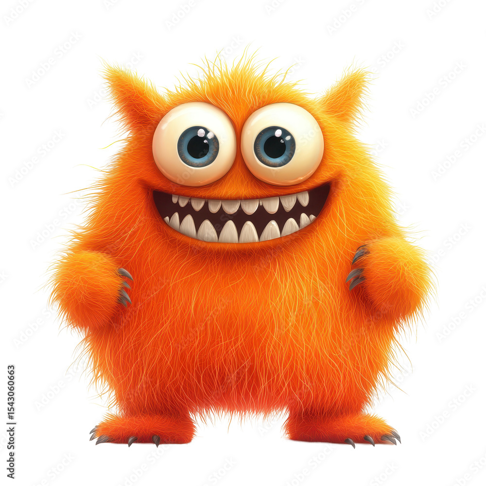 • Happy orange furry monster cartoon smiles joyfully on a plain white backdrop, Happy Orange Furry Monster Cartoon realistic on white background