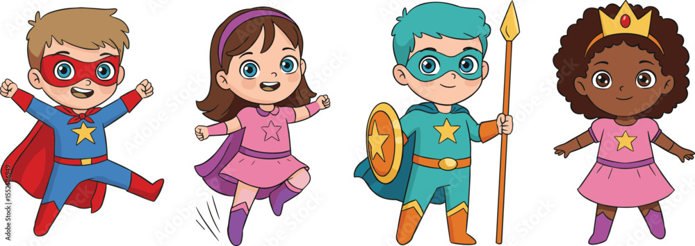 • Superhero kids costume illustration, fantasy character children, brave little heroes with cape, cartoon girl and boy in action, fun superhero outfit vector design