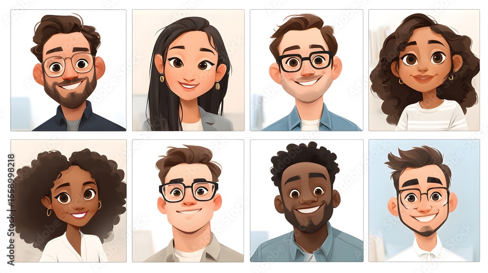 • Diverse illustrated portraits of individuals, each with unique expressions and styles, showcasing a range of characters