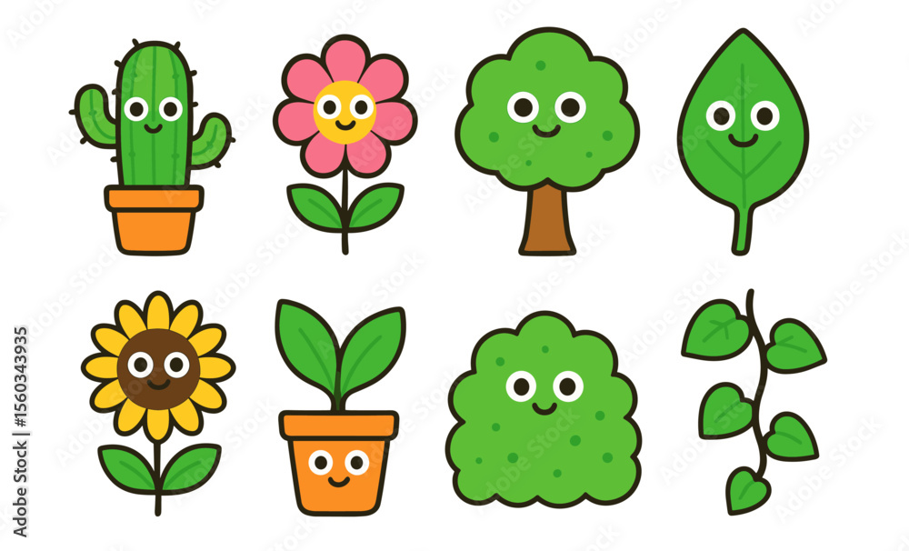 • Cute cartoon plants with smiling faces: adorable cactus, flowers, and trees for kids