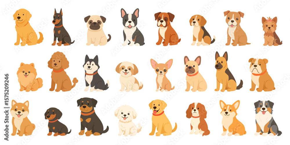 • Flat cartoon illustration of multiple dogs including popular dog breeds like Labrador, Husky, Poodle, Shiba Inu, and Bulldog. These cute dogs are shown in a sitting pose, ideal for pet-themed designs