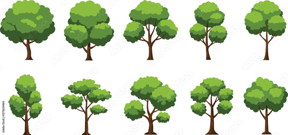 Green cartoon tree collection, vector nature elements, forest tree illustrations, landscape design assets, eco foliage graphics, isolated tree set Green cartoon tree collection od 0,00 zł Dopasuj i kup
