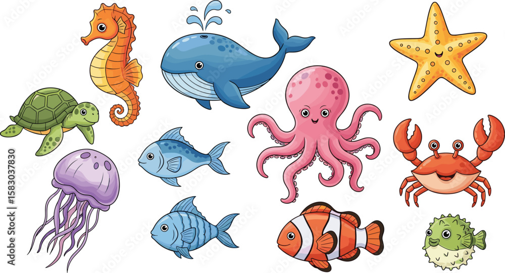 • Collection of aquatic cartoon animals on white background. Sea life, marine animals, underwater, ocean creatures, illustration, kids, cute, playful.