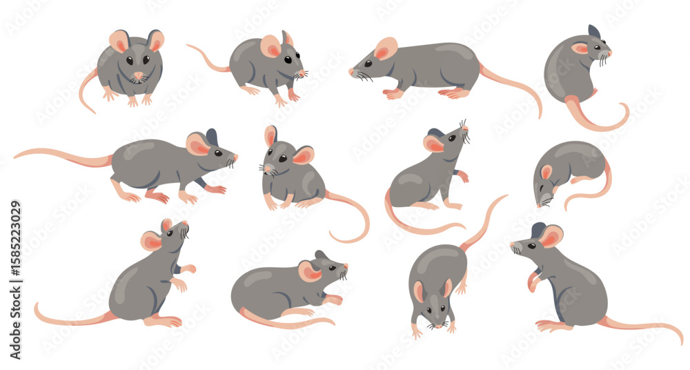 • Mouse animal. Cute cartoon laboratory mouse and rat characters, funny gray rodent wildlife fauna zoo creatures in different poses. Vector mice and rats flat set