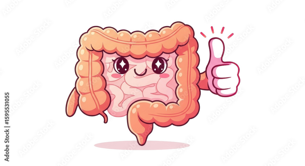• Happy colon cartoon character giving a thumbs up for good gut health and digestion