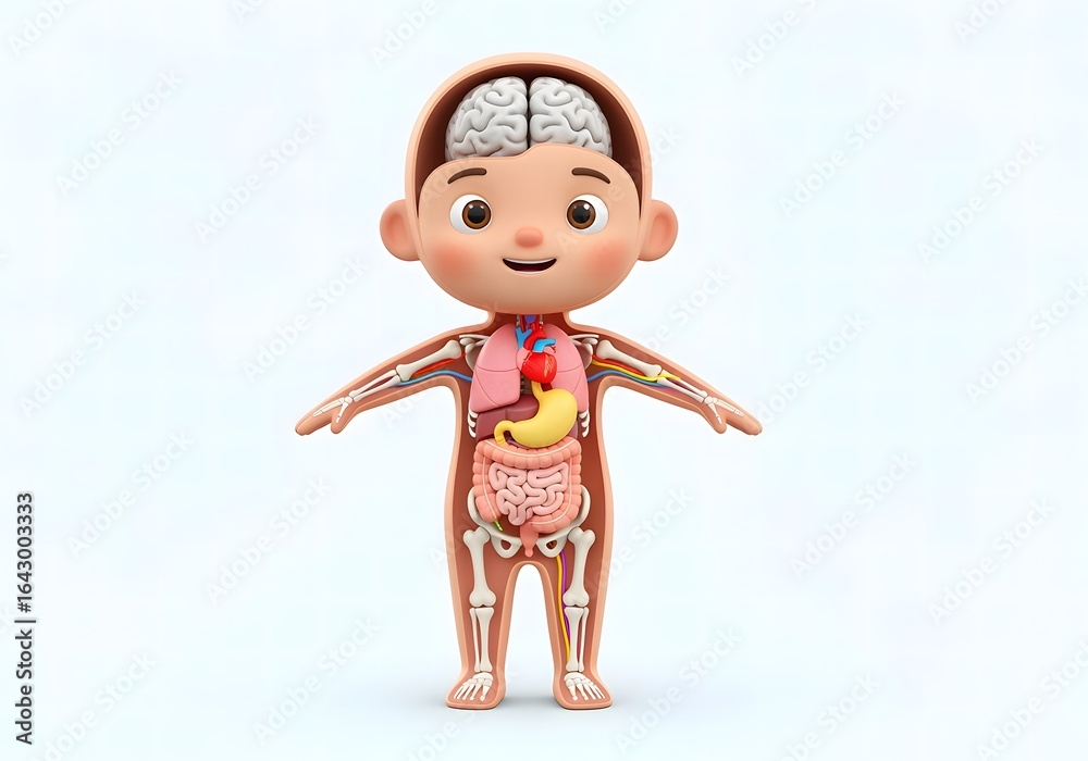• A cartoon illustration of a child's body with internal organs displayed, showing the brain, lungs, stomach, and intestines.