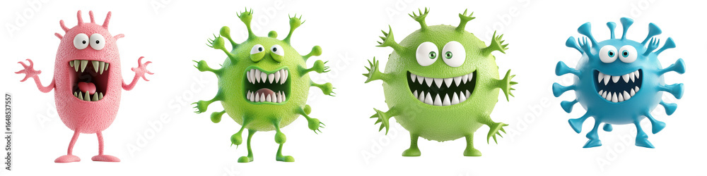 • Set of Colorful cartoon virus characters with exaggerated faces and features. isolate on transparent background
