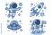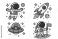 • Set of cute space exploration cartoon vector icons. Astronaut floating, planting flag on moon. Rocket ship launch. Alien in UFO. Cosmic character collection for kids design.