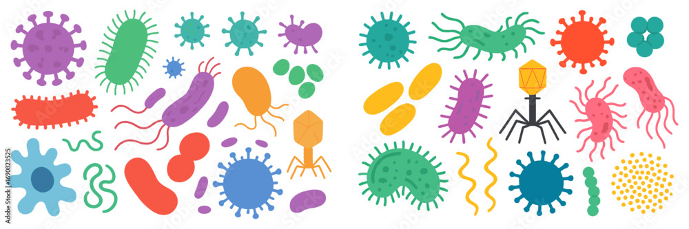 • Large collection of colorful cartoon microbes, germs, and bacteria cells showing different types of microorganisms for science and medical concepts