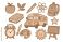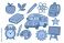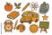 • Back to school retro sticker pack. Hand-drawn cartoon doodle icons. Vintage education element set with bus, backpack, book, apple, pencil, clock, art palette, science atom.