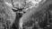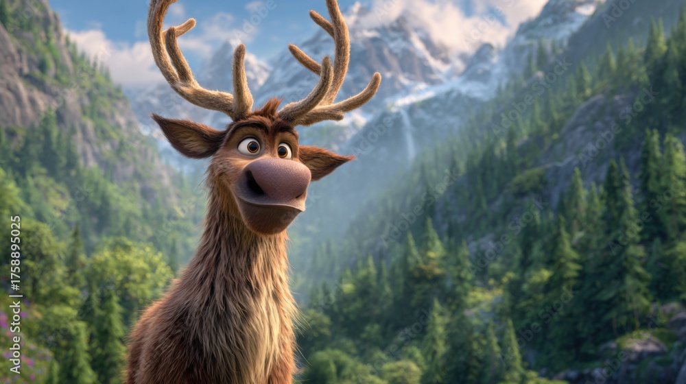 • An animated cartoon reindeer standing tall, with a playful expression. In the background, there's a majestic mountain landscape, creating a whimsical and enchanting scene