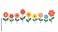 • A cheerful row of diverse cartoon flowers in various colors, with green stems and leaves, creating a lively and colorful garden scene, perfect for spring and summer themes.