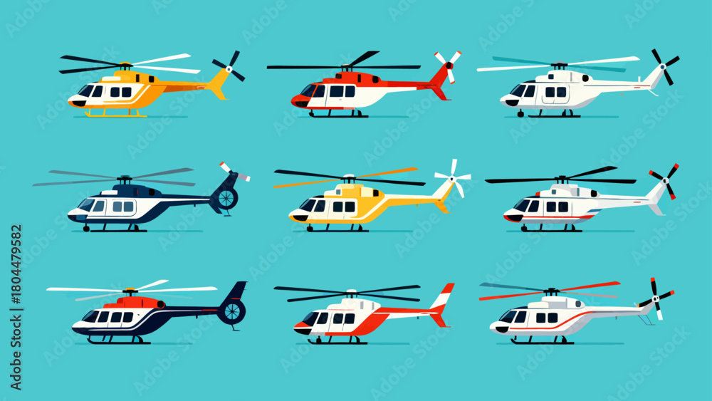 • A collection of various styles of helicopters, with cartoon hand-drawn vector illustrations