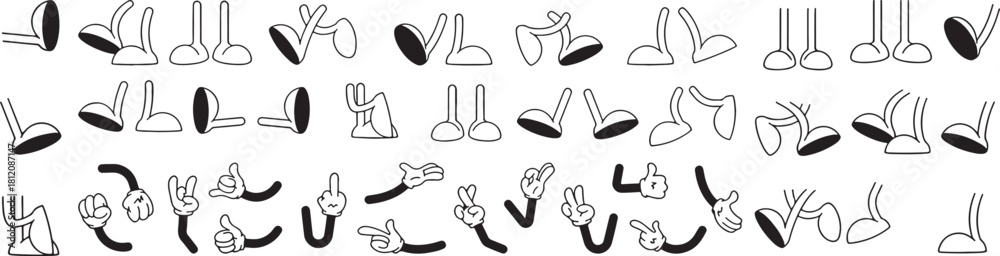 • Retro cartoon legs and hands, Hands with gloves and feet with boots, various poses for characters, a set of poses, gestures, placement of hands and feet. Mascot character set. Cartoon set of limbs.