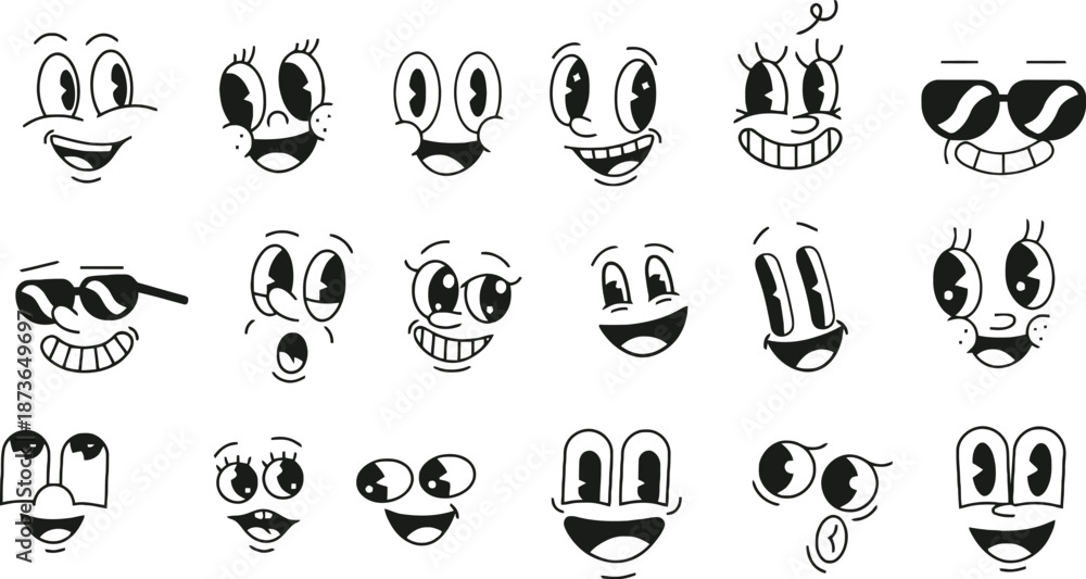 • Retro 1930s Style Cartoon Face Elements Set with Vintage Eyes and Mouths for Classic Animation Mascot Character Design Creator Kit