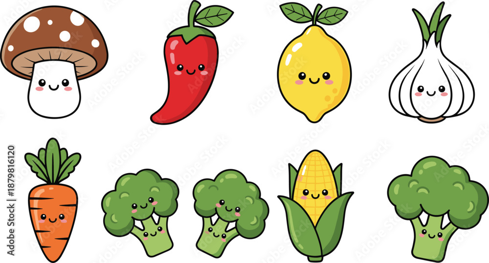 • Cute kawaii vegetable and fruit characters set with smiling faces isolated colorful cartoon vector illustration for kids food design elements