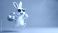 • Funny white bunny with pink sunglasses jumps holding basket with colorful eggs. Easter celebration cartoon character hops with egg on turquoise background, copy space. Happy spring holiday fun.
