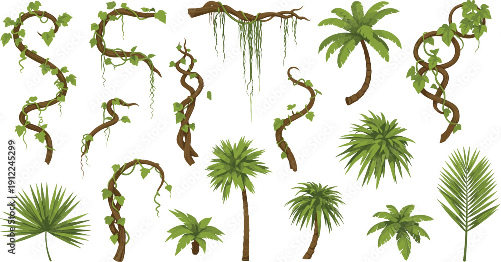 • Tropical jungle elements set with palm trees and hanging vines, cartoon forest plants collection for game design assets