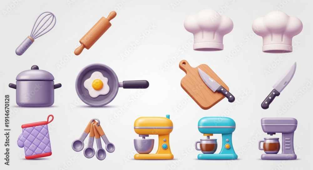 • Collection of cartoon kitchen utensils and cooking equipment.