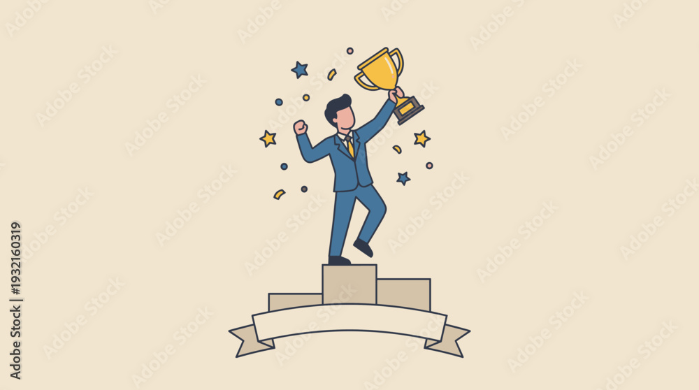 • Successful businessman celebrating career achievement on a winner's podium holding a gold trophy cup. Concept of leadership, business champion, winning award, and professional victory.