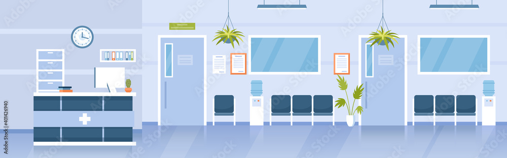 • Hospital reception hall clinic interior, cartoon modern empty medical hallway with bench