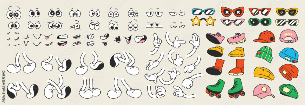 Vintage cartoon hands in gloves and feet in shoes. Cute animation character body parts. Comics arm gestures and walking leg poses set. Different foot movements and positions Dopasuj i kup Naklejka