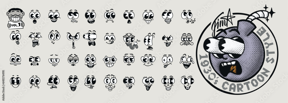 Dla Dzieci - Retro cartoon faces. 1930s Rubber Hose style facial expressions, doodle emoticon vector set #648376498