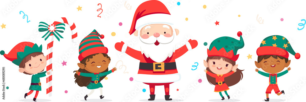 • Illustration of Christmas elves and Santa Claus jump and dance joyfully. Set of little Santa's helpers with holiday gifts and decorations. Adorable cartoon characters. Flat vector illustration.