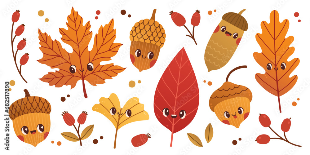 • Cute cartoon leaves and acorns vector illustration. Oak, acorn, tree leaves. Nature print in Scandinavian style