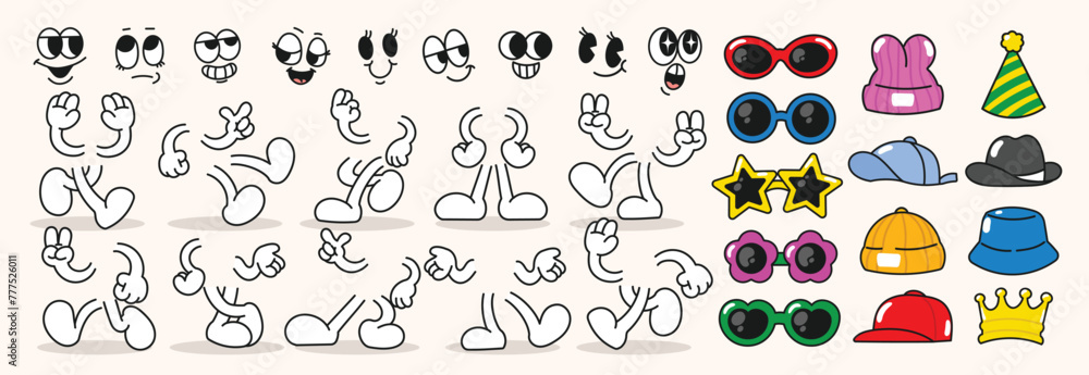 • Set of 70s groovy comic vector. Collection of cartoon character faces in different emotions, hand, glove, glasses, hat, shoes. Cute retro groovy hippie illustration for decorative, sticker.