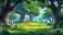 • Enchanting cartoon forest landscape with lush green trees, vibrant colors, and a peaceful atmosphere. Ideal background for fantasy, adventure, and nature scenes.