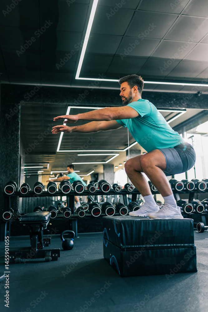 • Athletic man jumping during a workout in the gym...