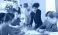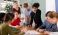 • Group of teenagers and students discuss the task at the table, they exchange opinions and theories against the background of teacher in classroom. Schoolchildren look at the paper and solve the task