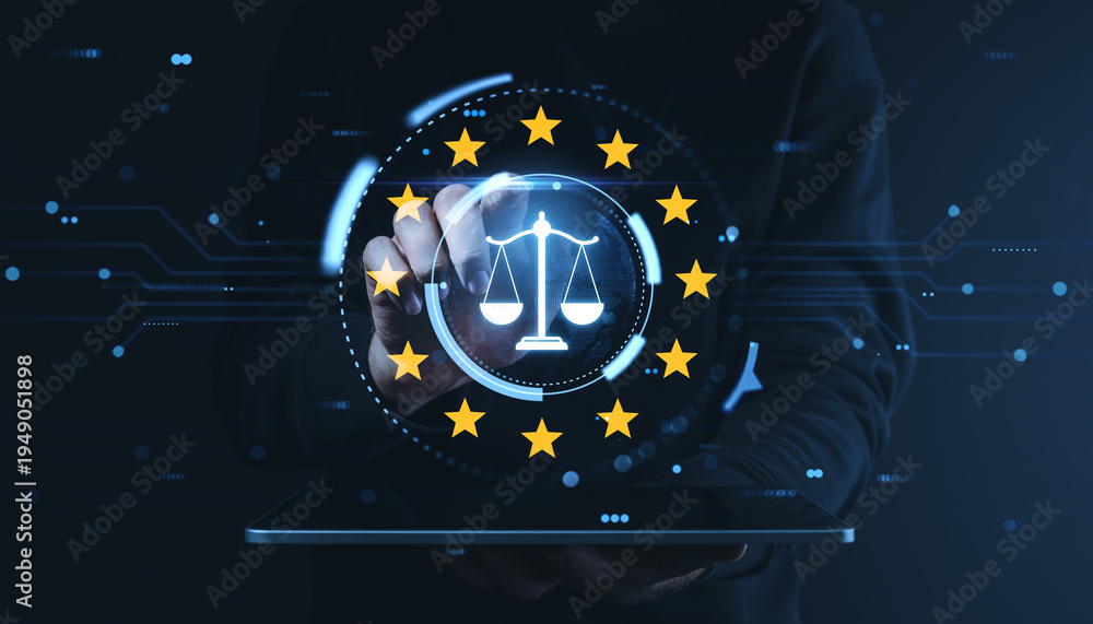 • Digital justice and EU law balance symbol over futuristic interface highlighting governance, regulation, cybersecurity, and legal oversight.