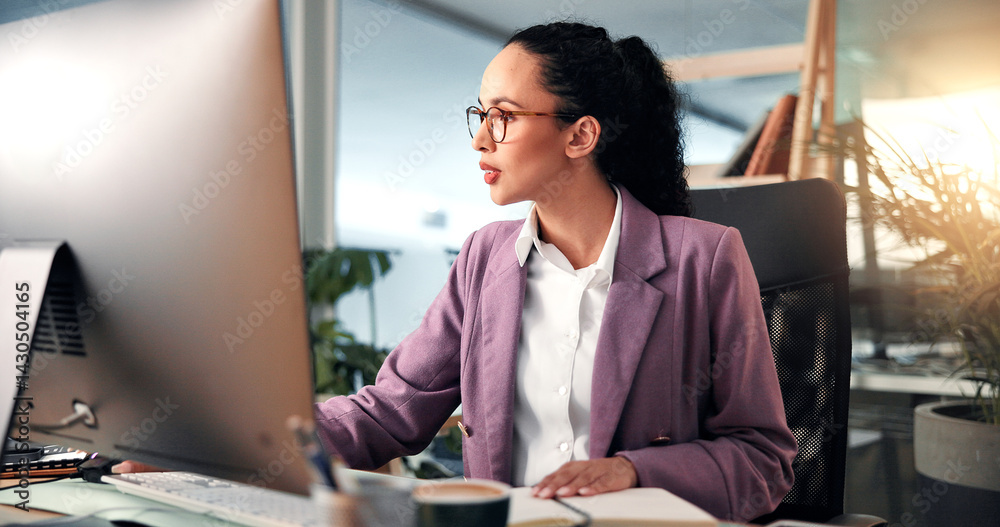 • Research, notebook or woman on computer in office for online project, review or economy website. Night, financial consultant and accountant on digital tech for planning budget, report or business