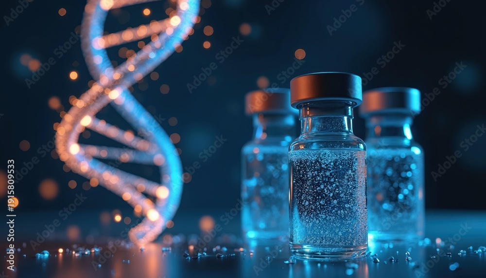 Glowing DNA helix, medical vials imply vaccine research. Science, medicine blend in lab setting. Biotechnology advances drug discovery, therapy development, disease prevention. Healthcare innovation od 0,00 zł Dopasuj i kup