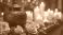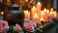 • Ornate urn with pink roses and lit candles creates solemn atmosphere for funeral or memorial service. Soft focus warm light evokes remembrance and peace.