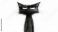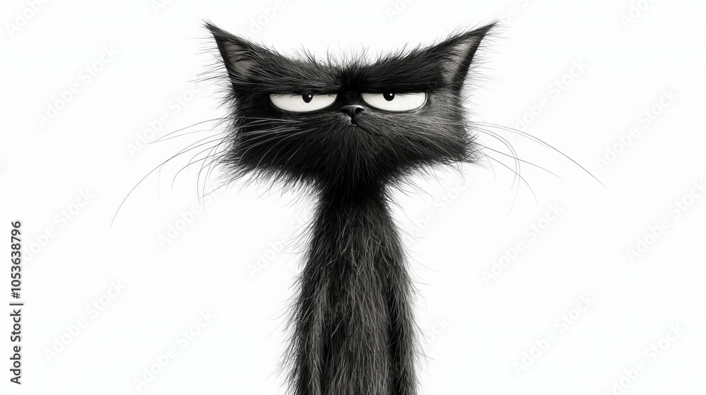 • A cartoon black cat with a grumpy expression, standing tall with long whiskers.