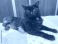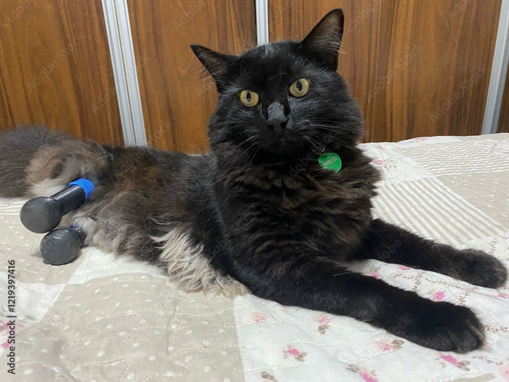 • Black cat with yellow eyes lying down with prosthetics