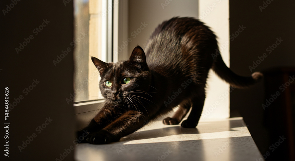 • Black Cat Stretching on Windowsill Bathed in Sunlight Home Pet Relaxing in the Warmth Feline Grace Domestic Animal Cute Creature Contented