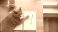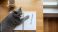 • Gray cat resting on a notebook with a pen and coffee mug nearby